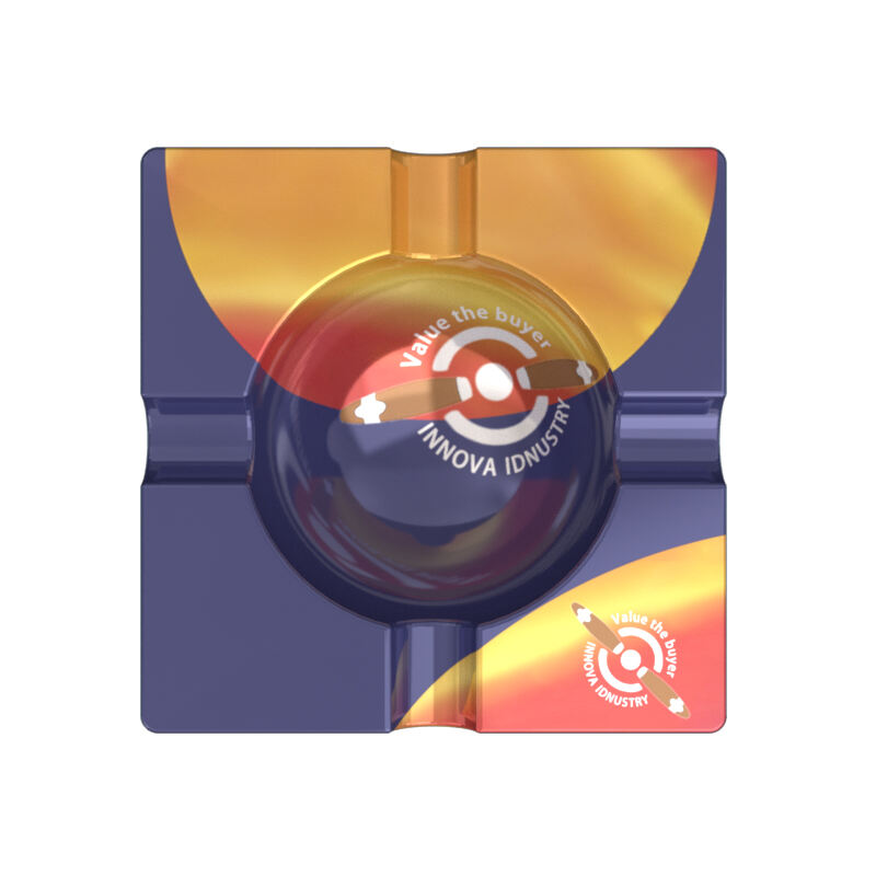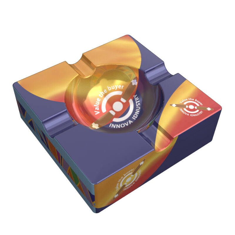 2. Der Aschenbecher beeindruckt durch eine markante Kombination aus königlichem Lila und Goldgelb, die durch sorgfältige Aufkleber-Anwendung entsteht und ein lebendiges sowie optisch ansprechendes Erscheinungsbild verleiht. Zudem trägt ein einzigartiges Logo, das elegant in der Mitte sowie entlang der Ränder gedruckt ist, mit einer persönlichen Note zur gehobenen Ästhetik bei.