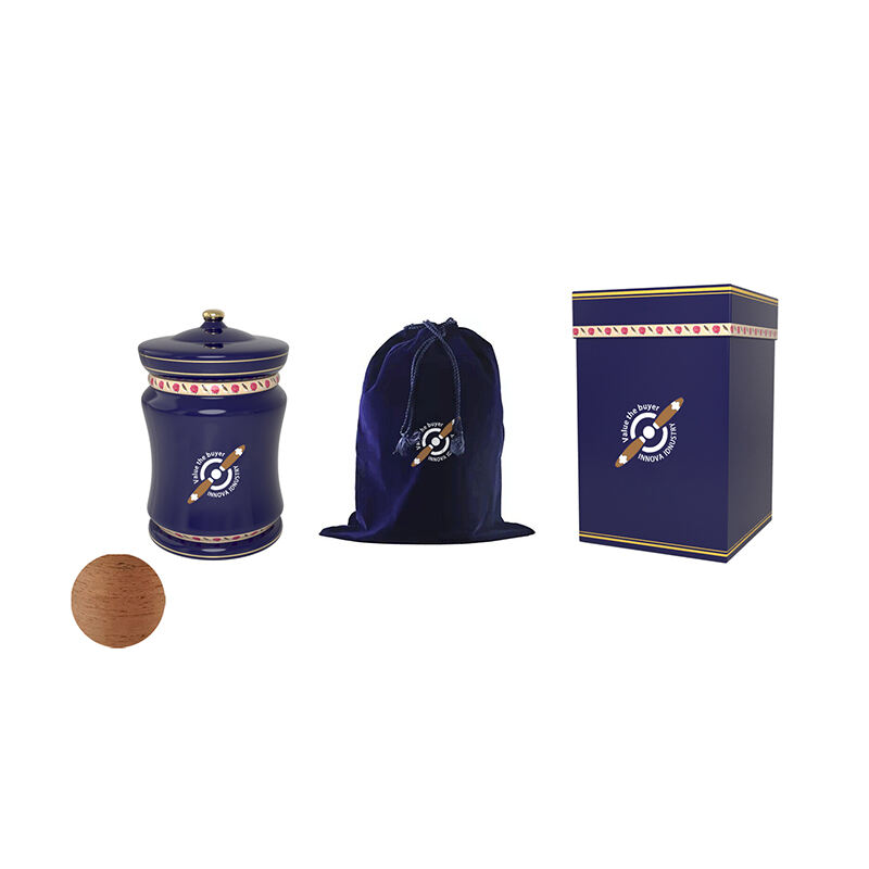 2. Lo primero que capta su atención es su impresionante apariencia. Fabricado en cerámica de alta calidad, este humidor está esmaltado en un azul añil profundo y cautivador, que desprende una atmósfera calmada y lujosa. Este tono exquisito lo convierte en una alternativa única frente a los humidores tradicionales de madera. El exterior lleva impreso su propio logotipo mediante una técnica de calcomanía. Esta técnica garantiza que el logotipo quede fusionado permanentemente con el esmalte cerámico, creando una superficie brillante, duradera y resistente a arañazos que muestra su calidad excepcional. El humidor viene presentado en una caja de regalo de cartón impresa y una suave bolsa de felpa con cordón.