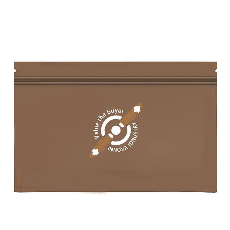 Como es inmediatamente evidente, esta es una bolsa marrón de plástico para cigarros fabricada con un panel frontal transparente. La totalidad del exterior está terminada en un rico tono marrón, con logotipos de marca elegantemente impresos en la parte delantera y trasera. Además, el interior está revestido con una capa de algodón humidificante, mientras que el cierre de cremallera de plástico reutilizable garantiza un sellado hermético. En general, esta bolsa mantiene eficazmente los niveles óptimos de humedad para el almacenamiento de cigarros.