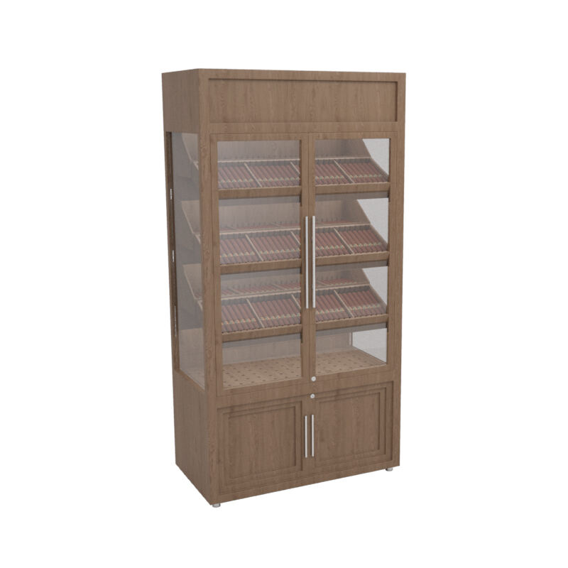 Este estuche expositor de cigarros premium es un mostrador de madera grande con doble puerta, cuidadosamente elaborado para servir como pieza central en cualquier entorno minorista de tabaco de alta gama o colección privada. El compartimento superior cuenta con elegantes puertas de cristal panorámico, que ofrecen a los clientes vistas sin obstáculos de los cigarros premium en su interior. Este diseño invita a los clientes a hojear y admirar los cigarros, transformando eficazmente su inventario en una atractiva exhibición visual.