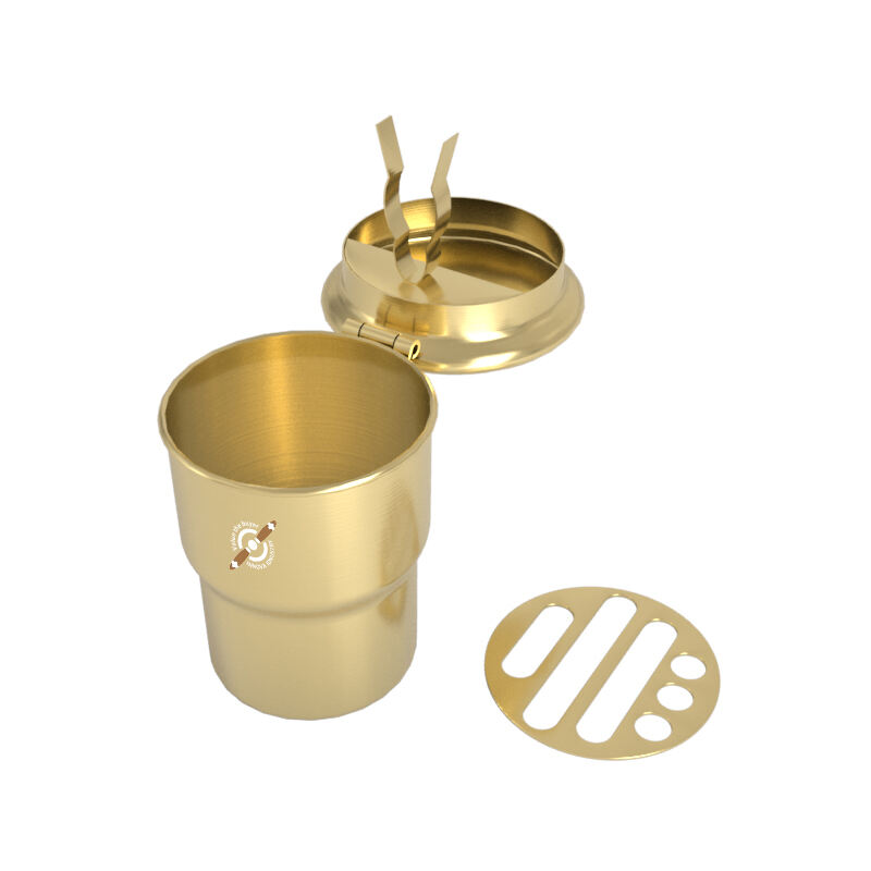 Como se demuestra claramente, este es un cenicero de acero inoxidable disponible en cuatro acabados elegantes: plateado, dorado, negro y marrón oscuro. Cada pieza presenta un logotipo prominente y está equipada con una tapa abatible, que evita eficazmente que los residuos y la ceniza ingresen al portaobjetos cuando no está en uso. También incluye un portavillas integrado para un solo puro, diseñado para alojar firmemente un cigarro. La innovadora pinza para puro garantiza un agarre firme sin dañar la envoltura del puro.