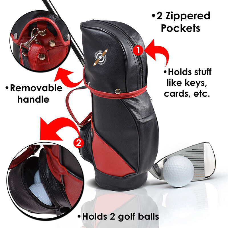 This golf bag is crafted from faux leather and features a removable top for easy access to your wine bottles. It also features two zippered pockets; one for your complimentary bottle opener and any small essentials, and the other for two golf balls.